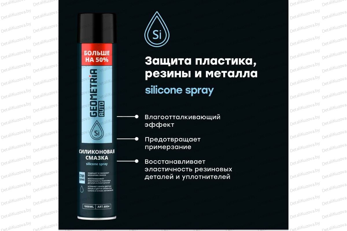 Легко и удобно используется, образует на поверхности сплошной полимерный слой молекул силикона, придающий водоотталкивающие свойства деталям любого типа механического оборудования.